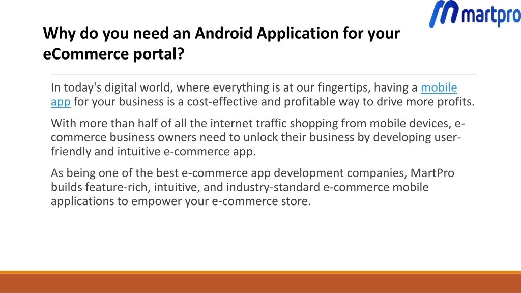 In today's digital world, where everything is at our fingertips, having a mobile app for your business is a cost-effective and profitable way to drive more profits.<br><br>With more than half of all the internet traffic shopping from mobile devices, e-commerce business owners need to unlock their business by developing user-friendly and intuitive e-commerce app.<br><br>As being one of the best e-commerce app development companies, MartPro builds feature-rich, intuitive, and industry-standard e-commerce mobile applications to empower your e-commerce store.