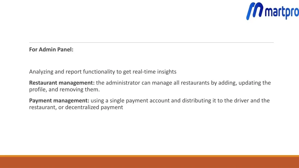 For Admin Panel: • Analyzing and report functionality to get real-time insights • Restaurant management: the administrator can manage all restaurants by adding, updating the profile, and removing them. • Payment management: using a single payment account and distributing it to the driver and the restaurant, or decentralized payment