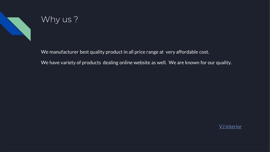 Why us ? We manufacturer best quality product in all price range at very affordable cost. We have variety of products dealing online website as well. We are known for our quality. VJ interior