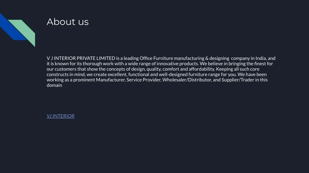 Table of content About us Service we offer Wide range of office chair Why us Mode of payment Contact no VJ INTERIOR