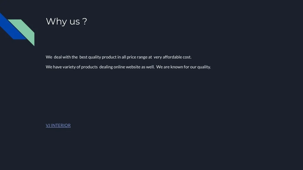 Why us ? We deal with the best quality product in all price range at very affordable cost. We have variety of products dealing online website as well. We are known for our quality. VJ INTERIOR