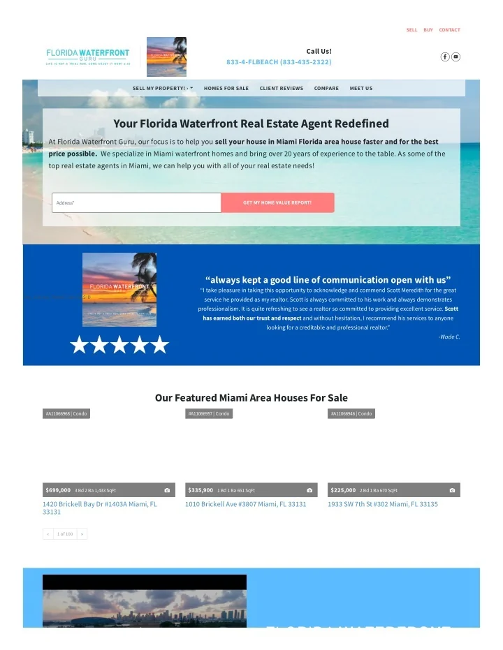 SELL BUY CONTACT Call Us! 833-4-FLBEACH (833-435-2322) SELL MY PROPERTY! › HOMES FOR SALE CLIENT REVIEWS COMPARE MEET US Your Florida Waterfront Real Estate Agent Redefined At Florida Waterfront Guru, our focus is to help you sell your house in Miami Florida area house faster and for the best price possible. We specialize in Miami waterfront homes and bring over 20 years of experience to the table. As some of the top real estate agents in Miami, we can help you with all of your real estate needs! GET MY HOME VALUE REPORT! GET MY HOME VALUE REPORT! Address* “always kept a good line of communication open with us” “I take pleasure in taking this opportunity to acknowledge and commend Scott Meredith for the great service he provided as my realtor. Scott is always committed to his work and always demonstrates professionalism. It is quite refreshing to see a realtor so committed to providing excellent service. Scott has earned both our trust and respect and without hesitation, I recommend his services to anyone looking for a creditable and professional realtor.” City, Address, Postal Code, MLS ID -Wade C. Our Featured Miami Area Houses For Sale #A11066968 | Condo #A11066957 | Condo #A11066946 | Condo $699,000 3 Bd 2 Ba 1,433 SqFt $335,900 1 Bd 1 Ba 651 SqFt $225,000 2 Bd 1 Ba 670 SqFt ? ? ? 1420 Brickell Bay Dr #1403A Miami, FL 33131 1010 Brickell Ave #3807 Miami, FL 33131 1933 SW 7th St #302 Miami, FL 33135 « 1 of 100 »
