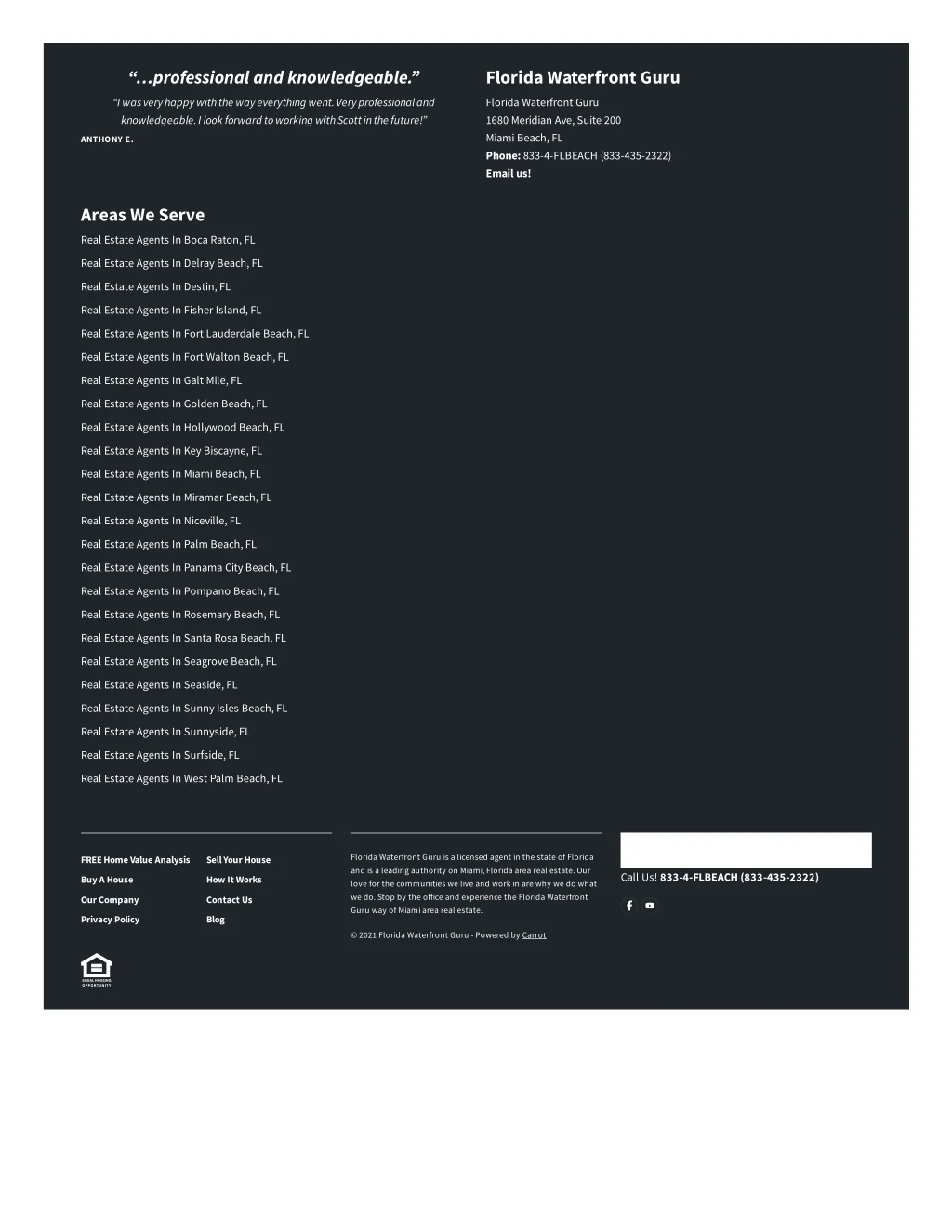 “…professional and knowledgeable.” Florida Waterfront Guru “I was very happy with the way everything went. Very professional and knowledgeable. I look forward to working with Scott in the future!” Florida Waterfront Guru 1680 Meridian Ave, Suite 200 Miami Beach, FL Phone: 833-4-FLBEACH (833-435-2322) Email us! ANTHONY E. Areas We Serve Real Estate Agents In Boca Raton, FL Real Estate Agents In Delray Beach, FL Real Estate Agents In Destin, FL Real Estate Agents In Fisher Island, FL Real Estate Agents In Fort Lauderdale Beach, FL Real Estate Agents In Fort Walton Beach, FL Real Estate Agents In Galt Mile, FL Real Estate Agents In Golden Beach, FL Real Estate Agents In Hollywood Beach, FL Real Estate Agents In Key Biscayne, FL Real Estate Agents In Miami Beach, FL Real Estate Agents In Miramar Beach, FL Real Estate Agents In Niceville, FL Real Estate Agents In Palm Beach, FL Real Estate Agents In Panama City Beach, FL Real Estate Agents In Pompano Beach, FL Real Estate Agents In Rosemary Beach, FL Real Estate Agents In Santa Rosa Beach, FL Real Estate Agents In Seagrove Beach, FL Real Estate Agents In Seaside, FL Real Estate Agents In Sunny Isles Beach, FL Real Estate Agents In Sunnyside, FL Real Estate Agents In Surfside, FL Real Estate Agents In West Palm Beach, FL Florida Waterfront Guru is a licensed agent in the state of Florida and is a leading authority on Miami, Florida area real estate. Our love for the communities we live and work in are why we do what we do. Stop by the office and experience the Florida Waterfront Guru way of Miami area real estate. FREE Home Value Analysis Sell Your House Call Us! 833-4-FLBEACH (833-435-2322) Buy A House How It Works Our Company Contact Us Privacy Policy Blog © 2021 Florida Waterfront Guru - Powered by Carrot