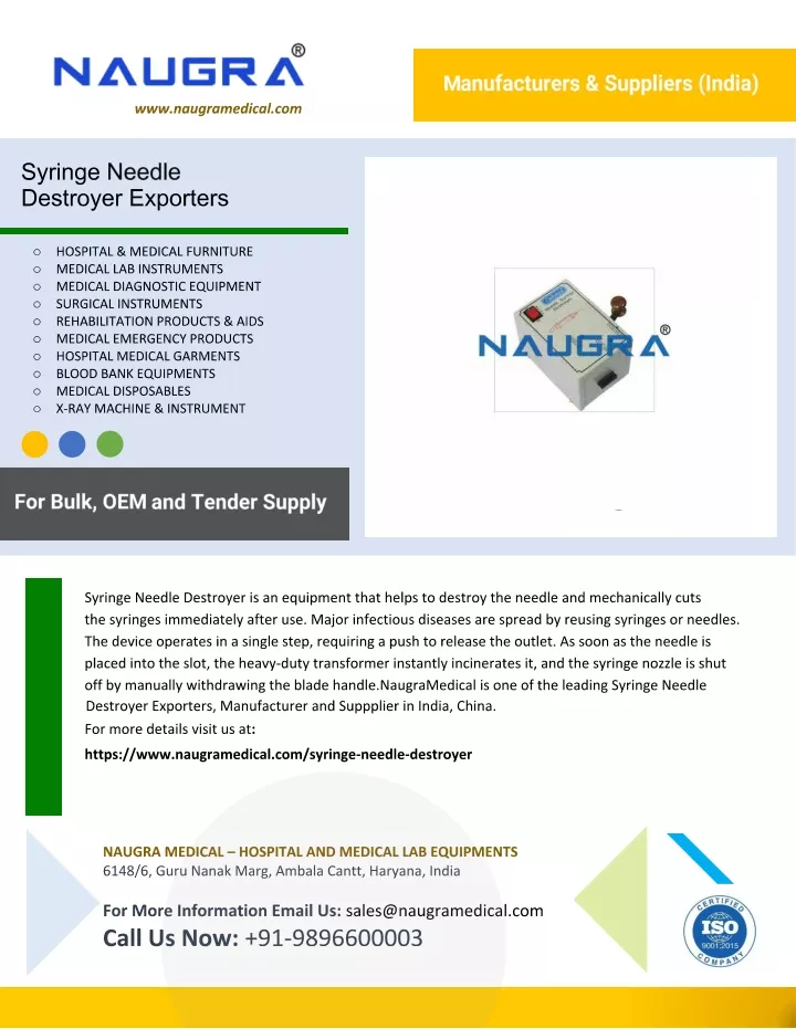 Syringe Needle Destroyer is an equipment that helps to destroy the needle and mechanically cuts the syringes immediately after use. Major infectious diseases are spread by reusing syringes or needles. NaugraMedical is one of the leading Syringe Needle Destroyer Exporters, Manufacturer and Suppplier in India, China.<br><br>For more details visit us at: https://www.naugramedical.com/syringe-needle-destroyer <br><br>