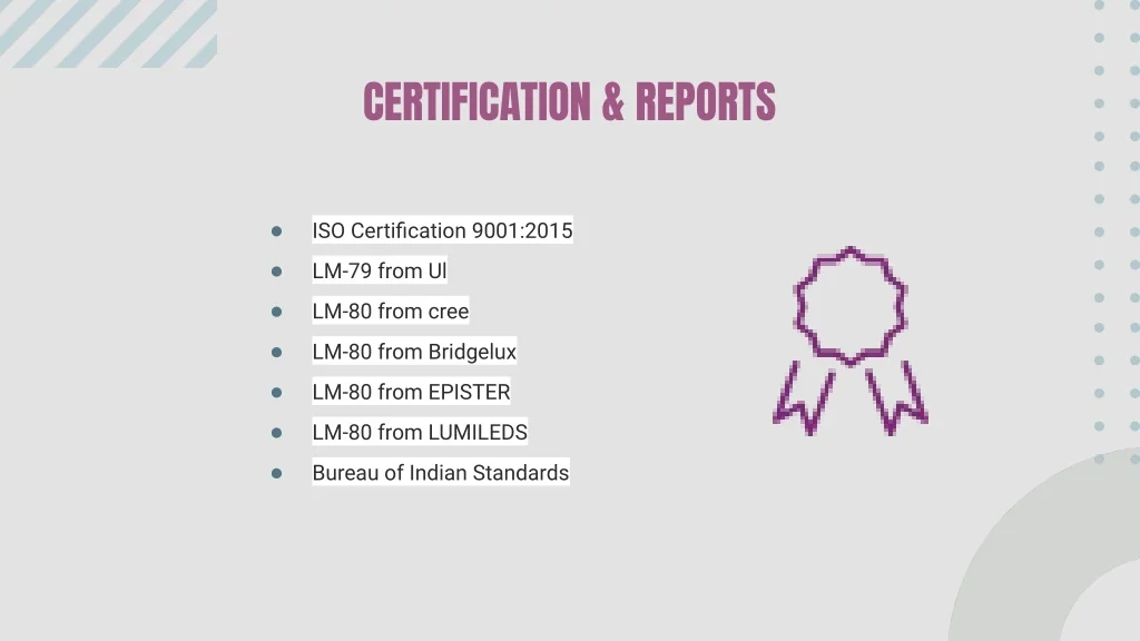 CERTIFICATION & REPORTS ● ISO Certification 9001:2015 ● LM-79 from Ul ● LM-80 from cree ● LM-80 from Bridgelux ● LM-80 from EPISTER ● LM-80 from LUMILEDS ● Bureau of Indian Standards