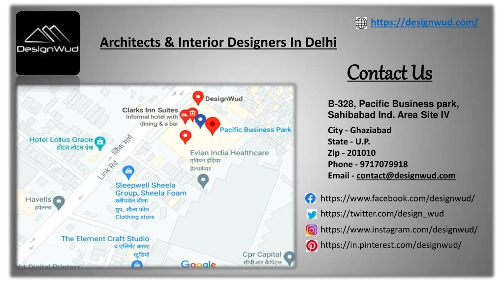 https://designwud.com/ Architects & Interior Designers In Delhi Contact Us B-328, Pacific Business park, Sahibabad Ind. Area Site IV City- Ghaziabad State - U.P. Zip - 201010 Phone - 9717079918 Email - contact@designwud.com https://www.facebook.com/designwud/ https://twitter.com/design_wud https://www.instagram.com/designwud/ https://in.pinterest.com/designwud/