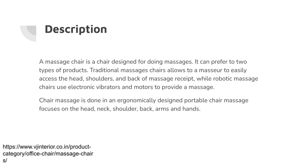 Description A massage chair is a chair designed for doing massages. It can prefer to two types of products. Traditional massages chairs allows to a masseur to easily access the head, shoulders, and back of massage receipt, while robotic massage chairs use electronic vibrators and motors to provide a massage. Chair massage is done in an ergonomically designed portable chair massage focuses on the head, neck, shoulder, back, arms and hands. https://www.vjinterior.co.in/product- category/office-chair/massage-chair s/