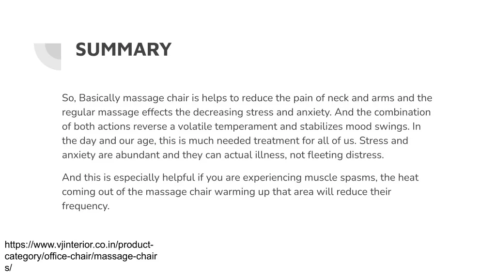SUMMARY So, Basically massage chair is helps to reduce the pain of neck and arms and the regular massage effects the decreasing stress and anxiety. And the combination of both actions reverse a volatile temperament and stabilizes mood swings. In the day and our age, this is much needed treatment for all of us. Stress and anxiety are abundant and they can actual illness, not fleeting distress. And this is especially helpful if you are experiencing muscle spasms, the heat coming out of the massage chair warming up that area will reduce their frequency. https://www.vjinterior.co.in/product- category/office-chair/massage-chair s/