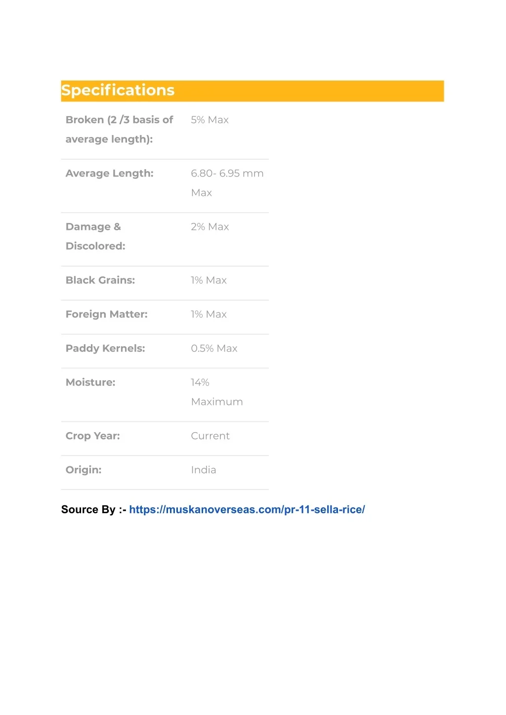 Specifications Broken (2 /3 basis of 5% Max average length): Average Length: 6.80- 6.95 mm Max Damage & 2% Max Discolored: Black Grains: 1% Max Foreign Matter: 1% Max Paddy Kernels: 0.5% Max Moisture: 14% Maximum Crop Year: Current Origin: India Source By :- https://muskanoverseas.com/pr-11-sella-rice/