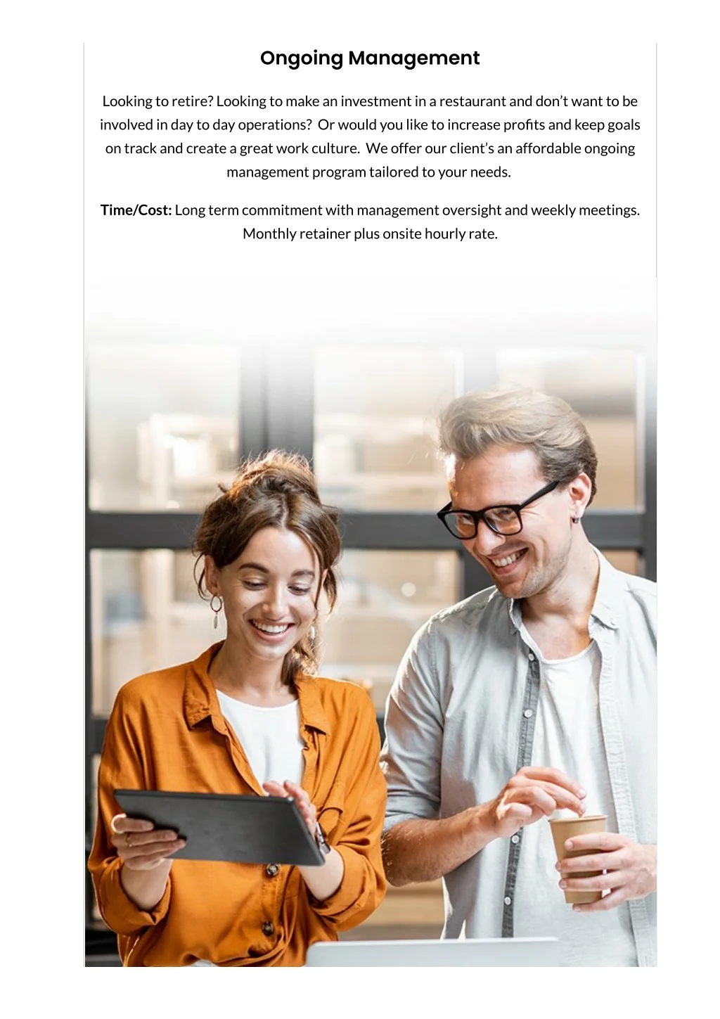 Ongoing Management Looking to retire? Looking to make an investment in a restaurant and don’t want to be involved in day to day operations? Or would you like to increase pro?ts and keep goals on track and create a great work culture. We offer our client’s an affordable ongoing management program tailored to your needs. Time/Cost: Long term commitment with management oversight and weekly meetings. Monthly retainer plus onsite hourly rate.