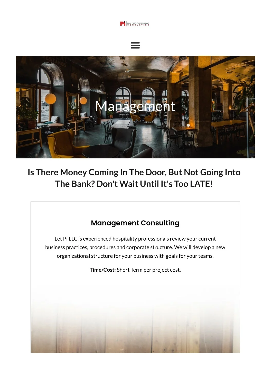 Management Is There Money Coming In The Door, But Not Going Into The Bank? Don't Wait Until It's Too LATE! Management Consulting Let Pi LLC.‘s experienced hospitality professionals review your current business practices, procedures and corporate structure. We will develop a new organizational structure for your business with goals for your teams. Time/Cost: Short Term per project cost.