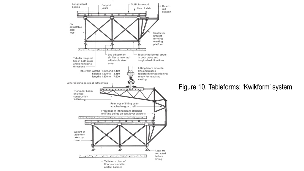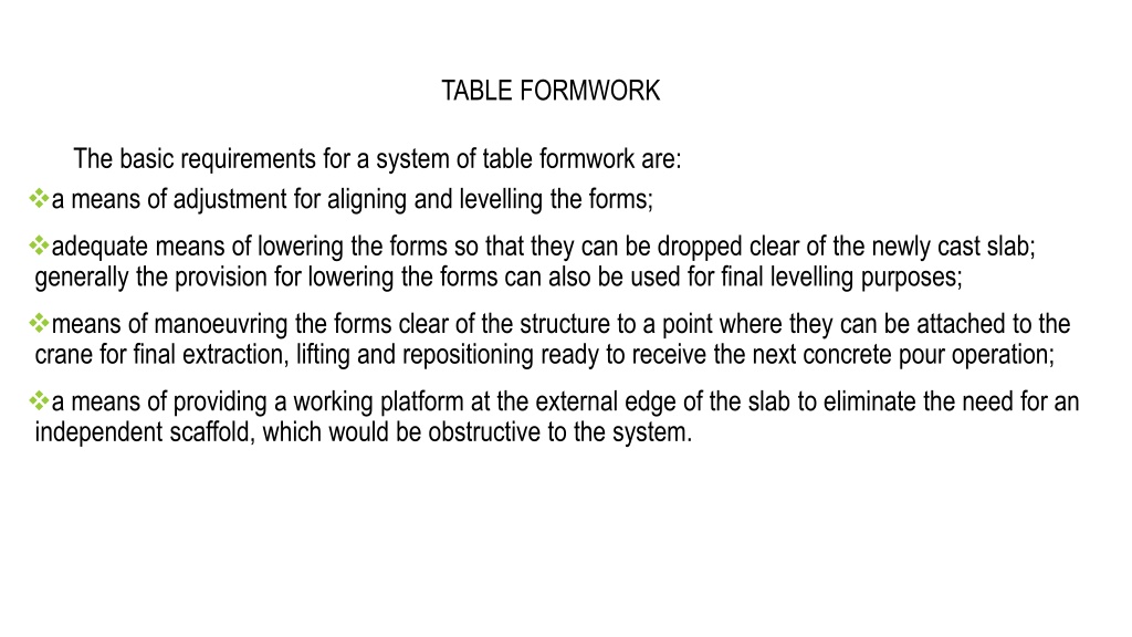 TABLE FORMWORK The basic requirements for a system of table formwork are: • a means of adjustment for aligning and levelling the forms; • adequate means of lowering the forms so that they can be dropped clear of the newly cast slab; generally the provision for lowering the forms can also be used for final levelling purposes; • means of manoeuvring the forms clear of the structure to a point where they can be attached to the crane for final extraction, lifting and repositioning ready to receive the next concrete pour operation; • a means of providing a working platform at the external edge of the slab to eliminate the need for an independent scaffold, which would be obstructive to the system.