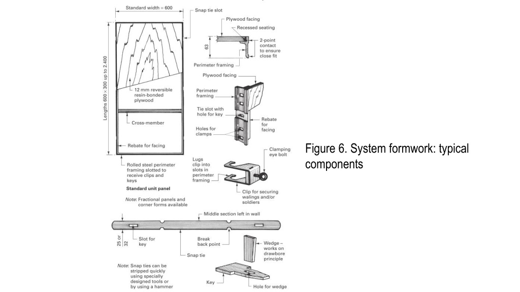 Patentorformworksystemshavebeendevisedtosatisfymostoftheaboverequirementsbythestandardisationofformsandbyeasymethodsofsecuringandbracingthepositionedformwork.Themajorcomponentofanyformworksystemistheunitpanel, whichshouldfulfilthefollowingrequirements: • available in a wide variety of sizes based on a standard module, usually multiples and submultiples of 300 mm; • manufactured from durable materials; • covered with a facing material that is durable and capable of producing the desired finish; • interchangeable so that they can be used for beams, columns and slabs; • formed so that they can be easily connected together to form large unit panels; • lightweight so that individual unit panels can be handled without mechanical aid; • designed so that the whole formwork can be assembled and dismantled easily by unskilled or semi-skilled labour; • capable of being adapted so that non-standard width inserts of traditional formwork materials can be included where lengths or widths are not exact multiples of the unit panels.