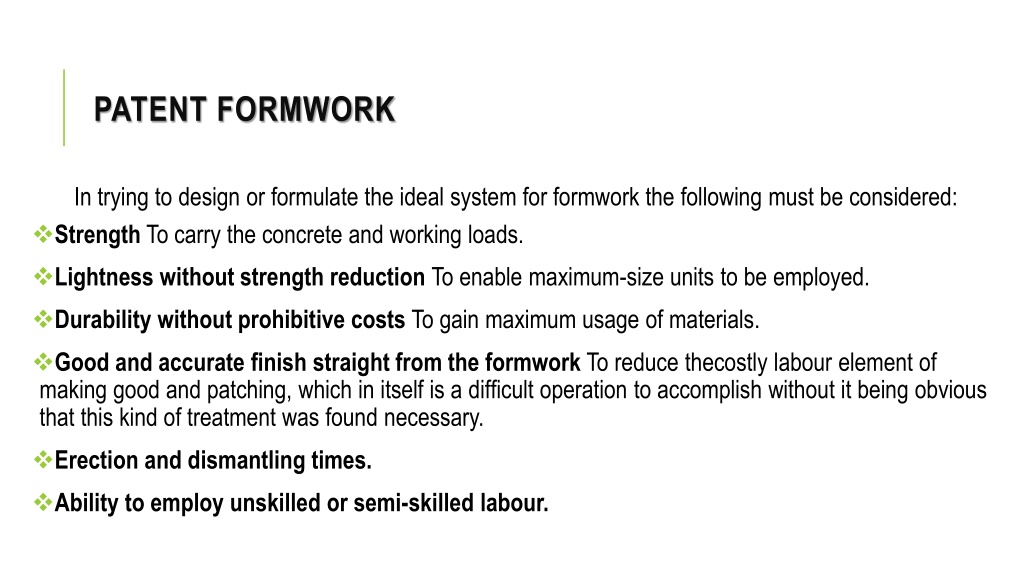PATENT FORMWORK Intryingtodesignorformulatetheidealsystemforformworkthefollowingmustbeconsidered: • Strength To carry the concrete and working loads. • Lightness without strength reduction To enable maximum-size units to be employed. • Durability without prohibitive costs To gain maximum usage of materials. • Good and accurate finish straight from the formwork To reduce thecostlylabour element of making good and patching, which in itself is a difficult operation to accomplish without it being obvious that this kind of treatment was found necessary. • Erection and dismantling times. • Ability to employ unskilled or semi-skilled labour.