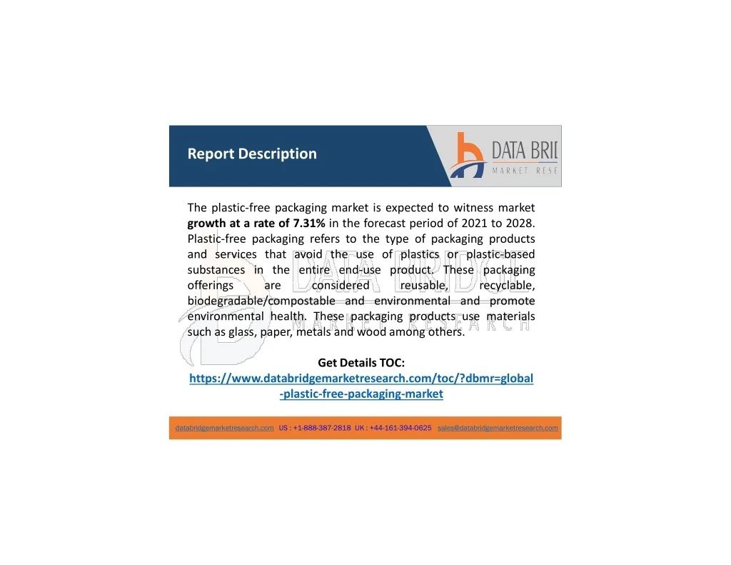 Plastic-Free Packaging Market Share, Growth, Trends & Outlook 2028 This Plastic-Free Packaging Market research document involves key data and information about the market, emerging trends, product usage, motivating factors for customers and competitors, restraints, brand positioning, and customer behavior, which is of utmost importance when it comes to achieving success in the competitive marketplace. This market report provides CAGR value competitive marketplace. This market report provides CAGR value fluctuation for the market. SWOT analysis is the standard, renowned and full-proof method to conduct the market research study which is used to formulate this particular Plastic-Free Packaging market document. Browse Full Report : https://www.databridgemarketresearch.com/reports/gl obal-plastic-free-packaging-market 1 databridgemarketresearch.com US : +1-888-387-2818 UK : +44-161-394-0625 sales@databridgemarketresearch.com