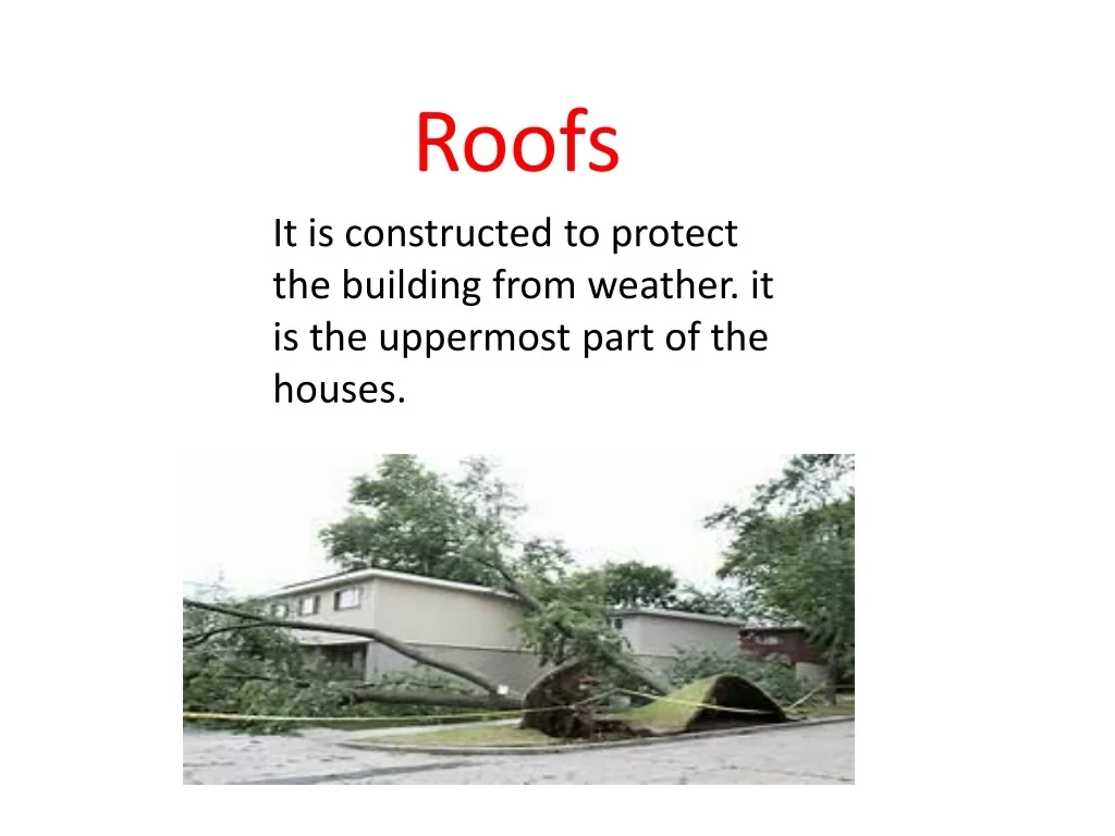 Roofs It is constructed to protect the building from weather. it is the uppermost part of the houses.