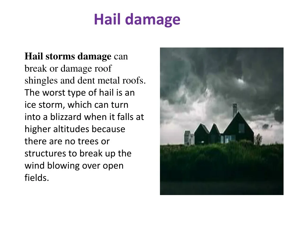 Hail damage Hail storms damage can break or damage roof shingles and dent metal roofs. The worst type of hail is an ice storm, which can turn into a blizzard when it falls at higher altitudes because there are no trees or structures to break up the wind blowing over open fields.
