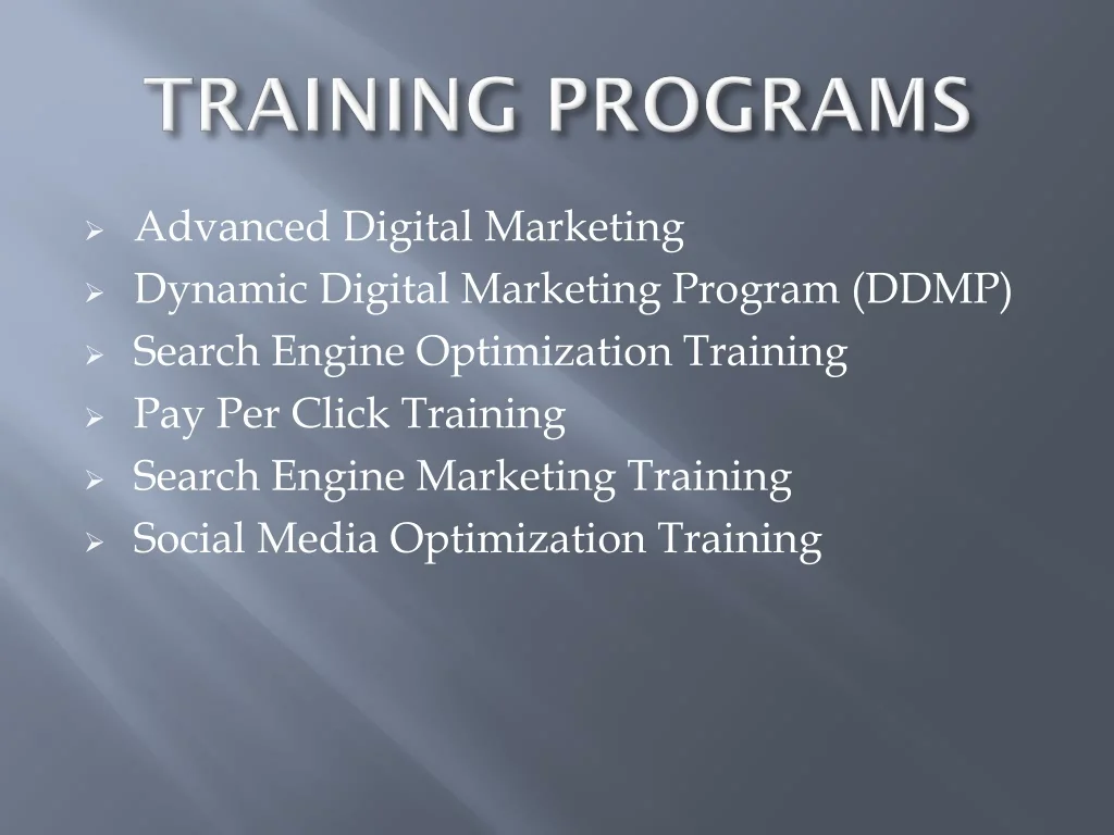 TRAINING PROGRAMS • Advanced Digital Marketing • Dynamic Digital Marketing Program (DDMP) • Search Engine Optimization Training • Pay Per Click Training • Search Engine Marketing Training • Social Media Optimization Training