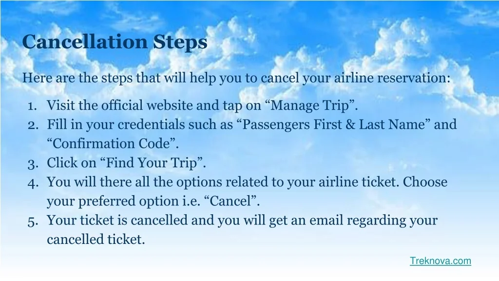 Cancellation Steps Here are the steps that will help you to cancel your airline reservation: • Visit the official website and tap on “Manage Trip”. • Fill in your credentials such as “Passengers First & Last Name” and “Confirmation Code”. • Click on “Find Your Trip”. • You will there all the options related to your airline ticket. Choose your preferred option i.e. “Cancel”. • Your ticket is cancelled and you will get an email regarding your cancelled ticket. Treknova.com