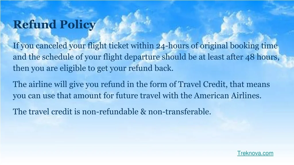 Refund Policy If you canceled your flight ticket within 24-hours of original booking time and the schedule of your flight departure should be at least after 48 hours, then you are eligible to get your refund back. The airline will give you refund in the form of Travel Credit, that means you can use that amount for future travel with the American Airlines. The travel credit is non-refundable & non-transferable. Treknova.com