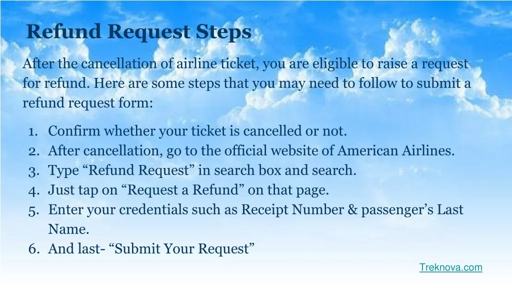 Refund Request Steps After the cancellation of airline ticket, you are eligible to raise a request for refund. Here are some steps that you may need to follow to submit a refund request form: • Confirm whether your ticket is cancelled or not. • After cancellation, go to the official website of American Airlines. • Type “Refund Request” in search box and search. • Just tap on “Request a Refund” on that page. • Enter your credentials such as Receipt Number & passenger’s Last Name. • And last- “Submit Your Request” Treknova.com
