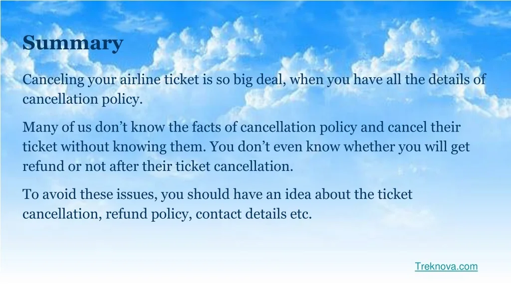 Summary Canceling your airline ticket is so big deal, when you have all the details of cancellation policy. Many of us don’t know the facts of cancellation policy and cancel their ticket without knowing them. You don’t even know whether you will get refund or not after their ticket cancellation. To avoid these issues, you should have an idea about the ticket cancellation, refund policy, contact details etc. Treknova.com