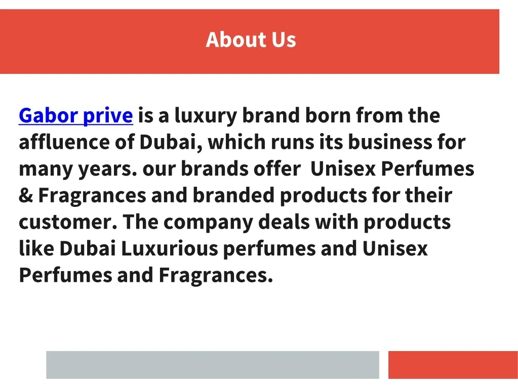 About Us Gabor prive is a luxury brand born from the affluence of Dubai, which runs its business for many years. our brands offer Unisex Perfumes & Fragrances and branded products for their customer. The company deals with products like Dubai Luxurious perfumes and Unisex Perfumes and Fragrances.