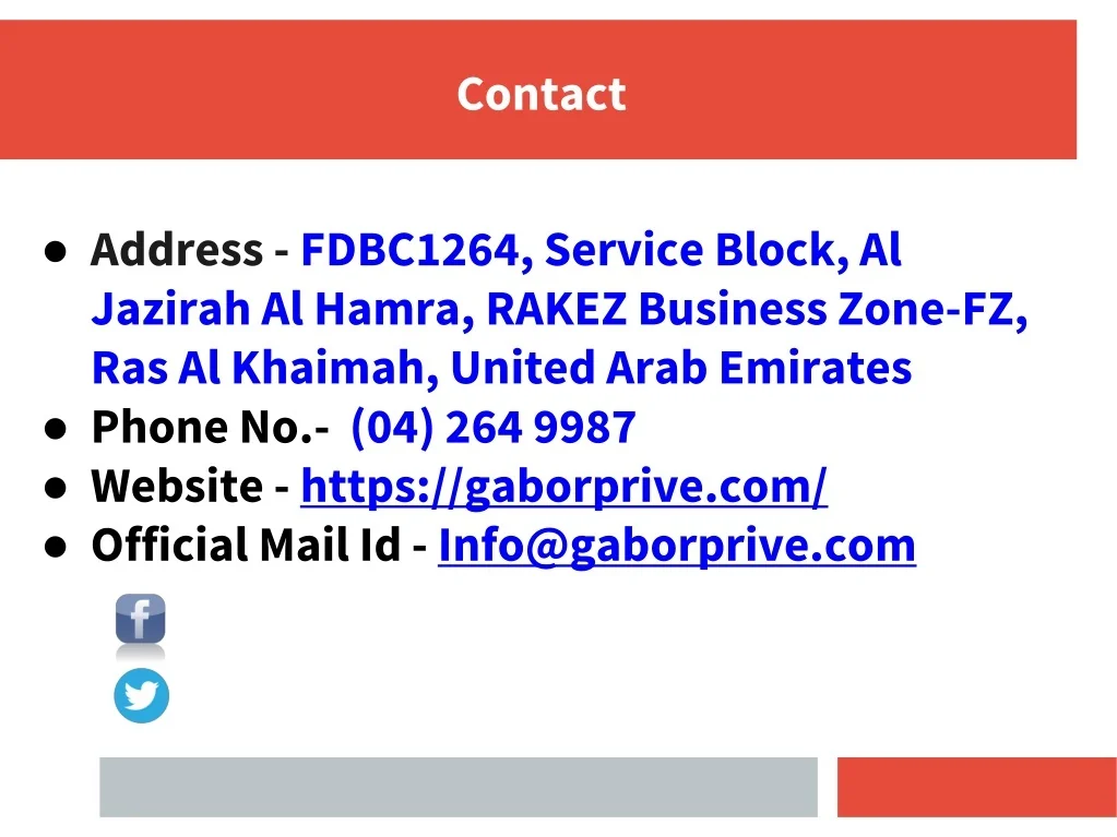 Contact • Address - FDBC1264, Service Block, Al Jazirah Al Hamra, RAKEZ Business Zone-FZ, Ras Al Khaimah, United Arab Emirates • Phone No.- (04) 264 9987 • Website - https://gaborprive.com/ • Official Mail Id - Info@gaborprive.com