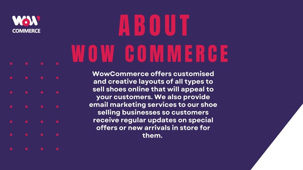 ABOUT WOW COMMERCE WowCommerce offers customised and creative layouts of all types to sell shoes online that will appeal to your customers. We also provide email marketing services to our shoe selling businesses so customers receive regular updates on special offers or new arrivals in store for them.