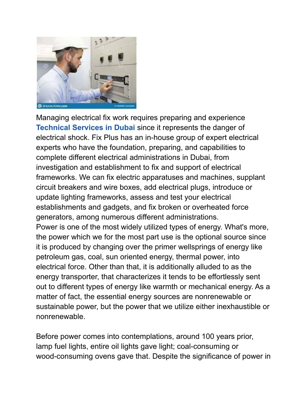Managing electrical fix work requires preparing and experience Technical Services in Dubai since it represents the danger of electrical shock. Fix Plus has an in-house group of expert electrical experts who have the foundation, preparing, and capabilities to complete different electrical administrations in Dubai, from investigation and establishment to fix and support of electrical frameworks. We can fix electric apparatuses and machines, supplant circuit breakers and wire boxes, add electrical plugs, introduce or update lighting frameworks, assess and test your electrical establishments and gadgets, and fix broken or overheated force generators, among numerous different administrations. Power is one of the most widely utilized types of energy. What's more, the power which we for the most part use is the optional source since it is produced by changing over the primer wellsprings of energy like petroleum gas, coal, sun oriented energy, thermal power, into electrical force. Other than that, it is additionally alluded to as the energy transporter, that characterizes it tends to be effortlessly sent out to different types of energy like warmth or mechanical energy. As a matter of fact, the essential energy sources are nonrenewable or sustainable power, but the power that we utilize either inexhaustible or nonrenewable. Before power comes into contemplations, around 100 years prior, lamp fuel lights, entire oil lights gave light; coal-consuming or wood-consuming ovens gave that. Despite the significance of power in
