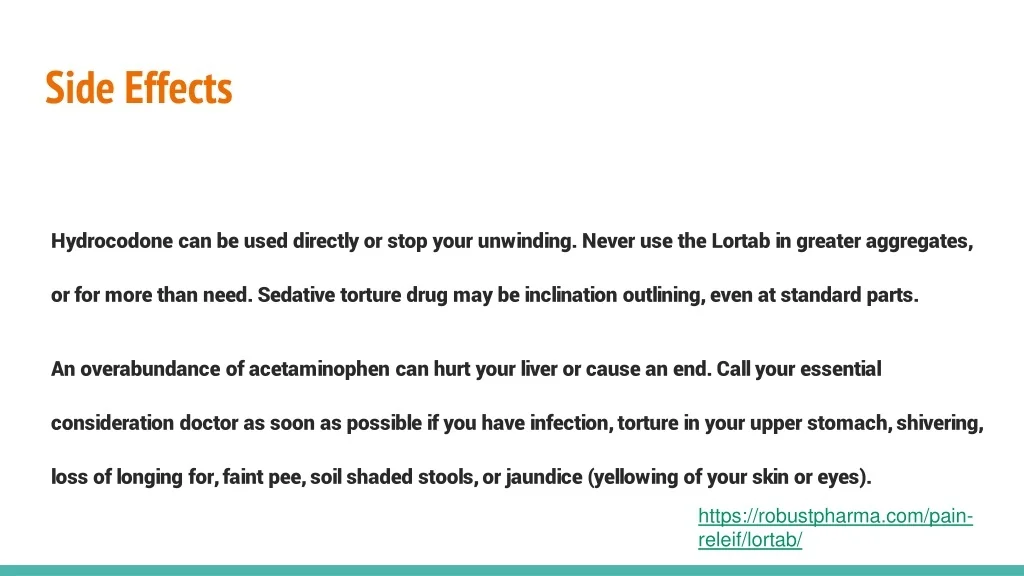 In this presentation we will discuss • What is lortab? • Types of lortab. • Side effects. • How to consume. • Precautions. • How should I buy lortab online without prescriptions. https://robustpharma.com/pain-releif/lortab/