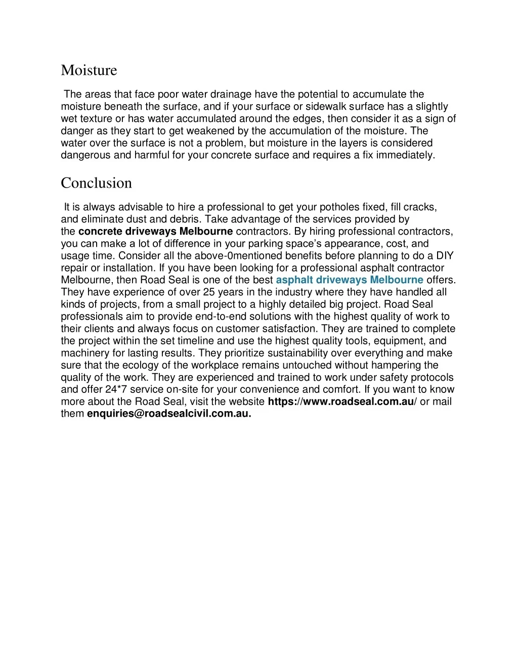 Moisture The areas that face poor water drainage have the potential to accumulate the moisture beneath the surface, and if your surface or sidewalk surface has a slightly wet texture or has water accumulated around the edges, then consider it as a sign of danger as they start to get weakened by the accumulation of the moisture. The water over the surface is not a problem, but moisture in the layers is considered dangerous and harmful for your concrete surface and requires a fix immediately. Conclusion It is always advisable to hire a professional to get your potholes fixed, fill cracks, and eliminate dust and debris. Take advantage of the services provided by the concrete driveways Melbourne contractors. By hiring professional contractors, you can make a lot of difference in your parking space’s appearance, cost, and usage time. Consider all the above-0mentioned benefits before planning to do a DIY repair or installation. If you have been looking for a professional asphalt contractor Melbourne, then Road Seal is one of the best asphalt driveways Melbourne offers. They have experience of over 25 years in the industry where they have handled all kinds of projects, from a small project to a highly detailed big project. Road Seal professionals aim to provide end-to-end solutions with the highest quality of work to their clients and always focus on customer satisfaction. They are trained to complete the project within the set timeline and use the highest quality tools, equipment, and machinery for lasting results. They prioritize sustainability over everything and make sure that the ecology of the workplace remains untouched without hampering the quality of the work. They are experienced and trained to work under safety protocols and offer 24*7 service on-site for your convenience and comfort. If you want to know more about the Road Seal, visit the website https://www.roadseal.com.au/ or mail them enquiries@roadsealcivil.com.au.