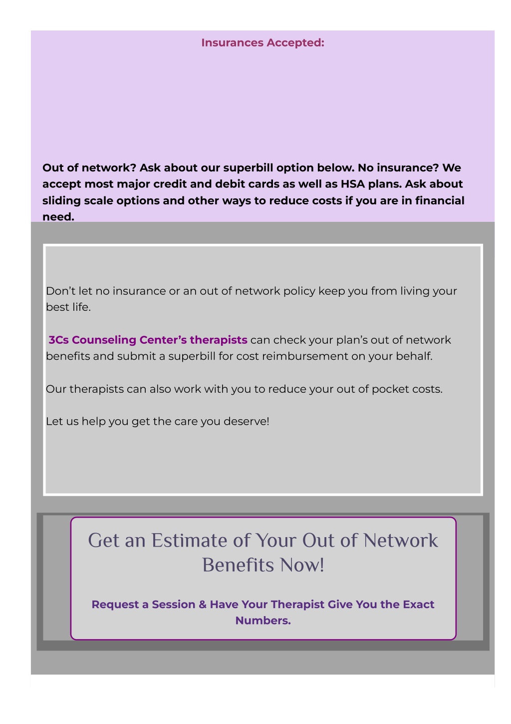 Insurances Accepted: Out of network? Ask about our superbill option below. No insurance? We accept most major credit and debit cards as well as HSA plans. Ask about sliding scale options and other ways to reduce costs if you are in ?nancial need. Don’t let no insurance or an out of network policy keep you from living your best life. 3Cs Counseling Center’s therapists can check your plan’s out of network bene?ts and submit a superbill for cost reimbursement on your behalf. Our therapists can also work with you to reduce your out of pocket costs. Let us help you get the care you deserve! Get an Estimate of Your Out of Network Benefits Now! Request a Session & Have Your Therapist Give You the Exact Numbers.