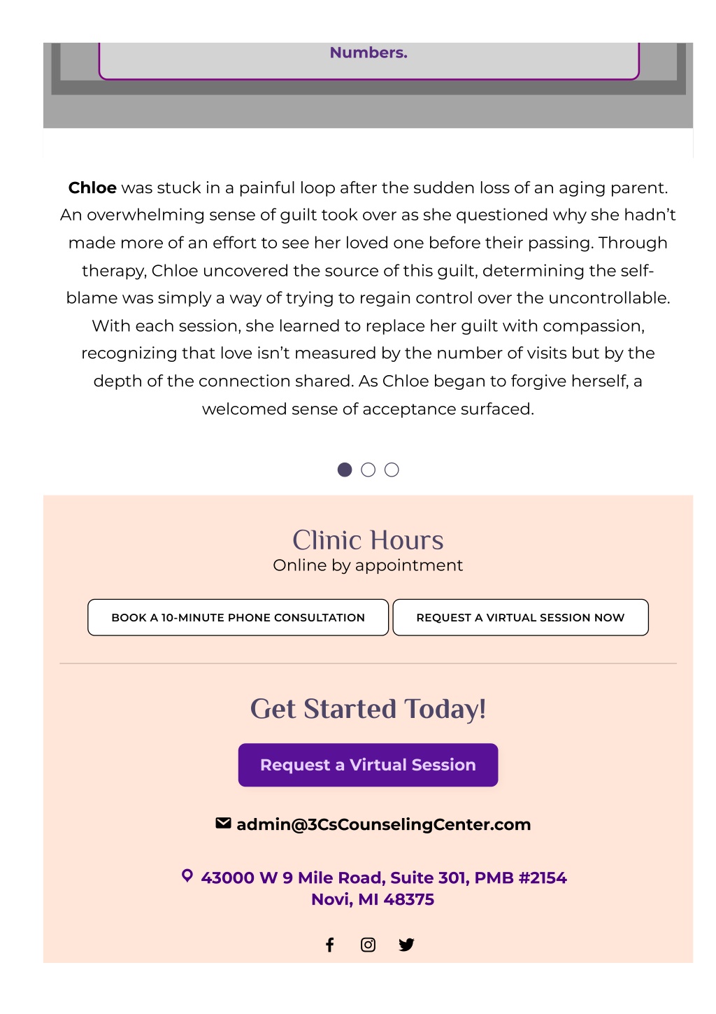 Numbers. Chloe was stuck in a painful loop after the sudden loss of an aging parent. An overwhelming sense of guilt took over as she questioned why she hadn’t made more of an effort to see her loved one before their passing. Through therapy, Chloe uncovered the source of this guilt, determining the self- blame was simply a way of trying to regain control over the uncontrollable. With each session, she learned to replace her guilt with compassion, recognizing that love isn’t measured by the number of visits but by the depth of the connection shared. As Chloe began to forgive herself, a welcomed sense of acceptance surfaced. Clinic Hours Online by appointment BOOK A 10-MINUTE PHONE CONSULTATION REQUEST A VIRTUAL SESSION NOW Get Started Today! Request a Virtual Session admin@3CsCounselingCenter.com 43000 W 9 Mile Road, Suite 301, PMB #2154 Novi, MI 48375