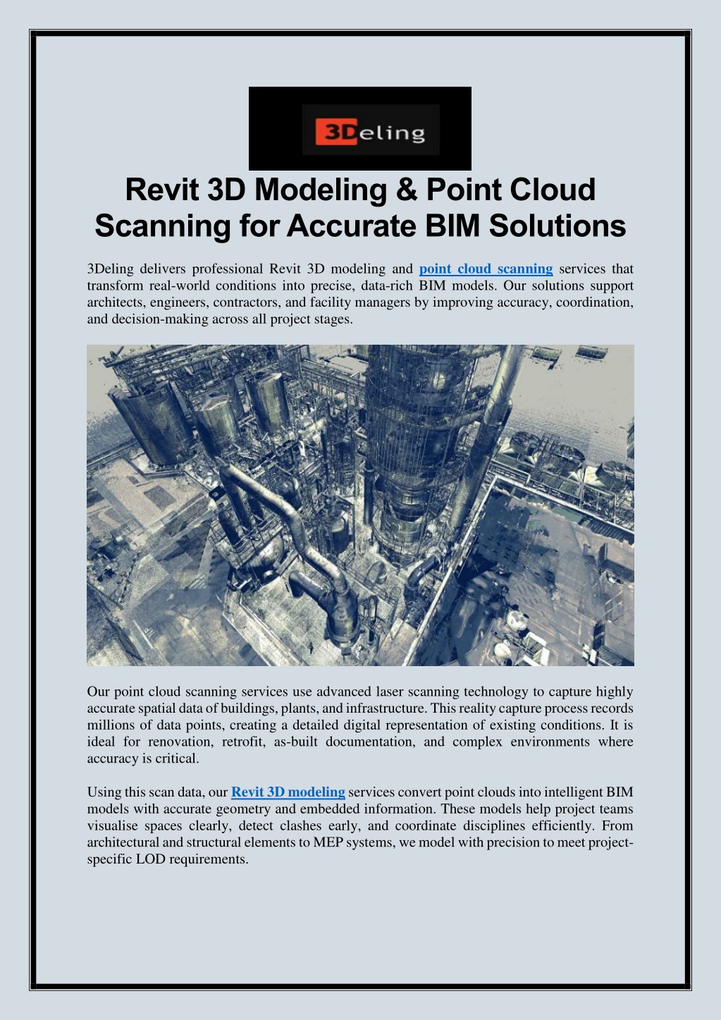 1. Revit 3D Modeling & Point Cloud Scanning for Accurate BIM Solutions 3Deling delivers professional Revit 3D modeling and point cloud scanning services that transform real-world conditions into precise, data-rich BIM models. Our solutions support architects, engineers, contractors, and facility managers by improving accuracy, coordination, and decision-making across all project stages. Our point cloud scanning services use advanced laser scanning technology to capture highly accurate spatial data of buildings, plants, and infrastructure. This reality capture process records millions of data points, creating a detailed digital representation of existing conditions. It is ideal for renovation, retrofit, as-built documentation, and complex environments where accuracy is critical. Using this scan data, our Revit 3D modeling services convert point clouds into intelligent BIM models with accurate geometry and embedded information. These models help project teams visualise spaces clearly, detect clashes early, and coordinate disciplines efficiently. From architectural and structural elements to MEP systems, we model with precision to meet project- specific LOD requirements.