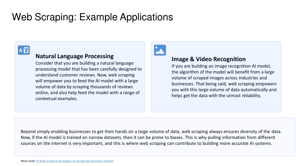 Web Scraping: Example Applications Natural Language Processing Consider that you are building a natural language processing model that has been carefully designed to understand customer reviews. Now, web scraping will empower you to feed the AI model with a large volume of data by scraping thousands of reviews online, and also help feed the model with a range of contextual examples. Image & Video Recognition If you are building an image recognition AI model, the algorithm of the model will benefit from a large volume of scraped images across industries and businesses. That being said, web scraping empowers you with this large volume of data automatically and helps get the data with the utmost reliability. Beyond simply enabling businesses to get their hands on a large volume of data, web scraping always ensures diversity of the data. Now, if the AI model is trained on narrow datasets, then it can be prone to biases. This is why pulling information from different sources on the internet is very important, and this is where web scraping can contribute to building more accurate AI systems. Must read: AI Web Scraping Strategies to Accelerate Business Growth