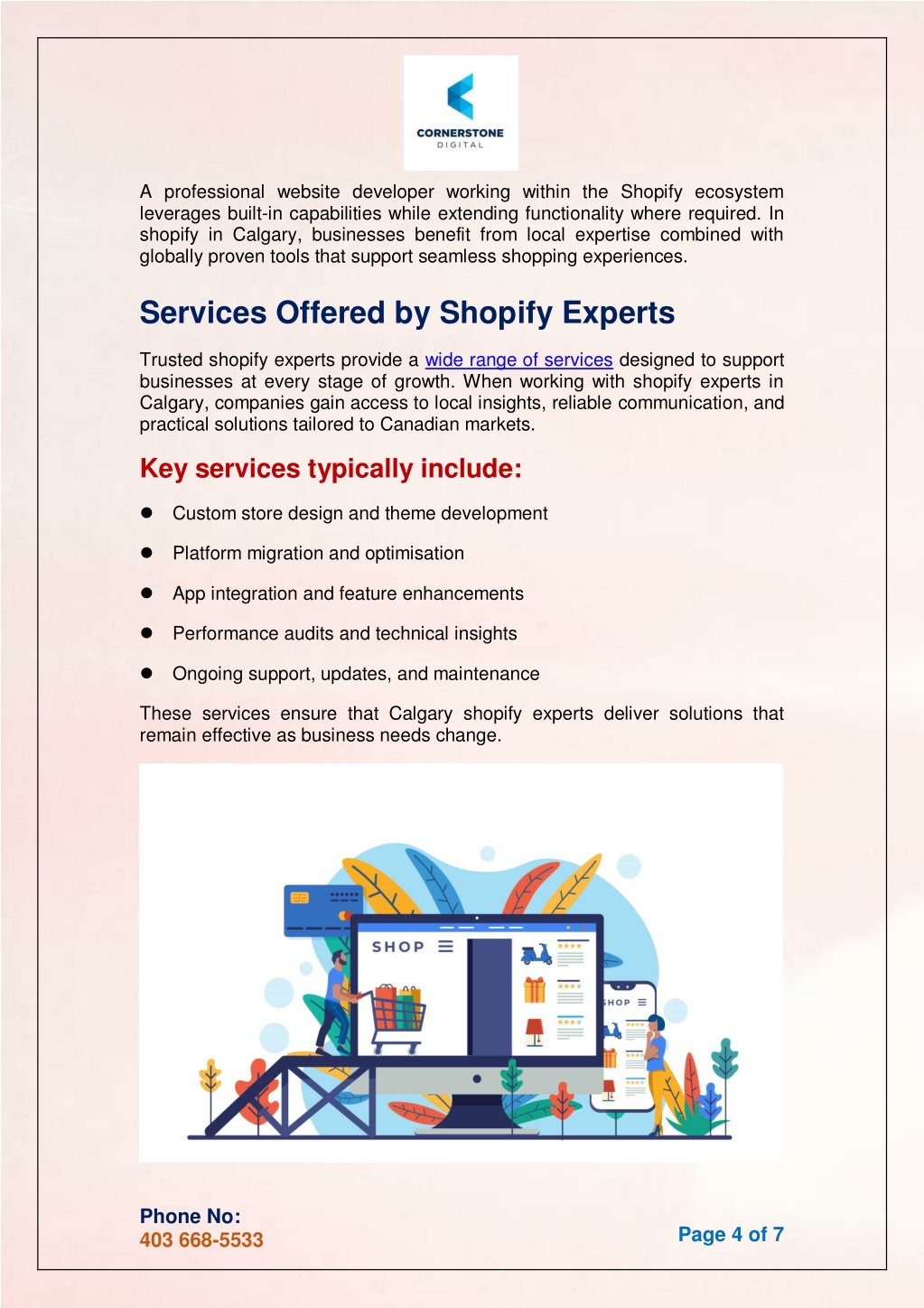 Can Shopify integrate with other business systems? Yes, Shopify can integrate with inventory management, CRM, marketing tools, and analytics platforms to support streamlined business operations. Conclusion: Build for Growth With the Right Expertise Choosing an expert-led approach to Shopify development is an investment in long-term success. With the right strategy, technology, and ongoing support, businesses can create scalable e-commerce solutions that evolve alongside customer expectations and market demands. Partnering with experienced professionals ensures that every aspect of the online store supports growth, performance, and trust. Call to Action: If you’re ready to strengthen your online business with scalable, future-ready e-commerce solutions, connect with experienced Shopify professionals in Calgary to turn your vision into a high-performing digital store. Social Profiles Facebook | linkedin Email Us: info@cornerstonedigital.ca Phone No: 403 668-5533 Page 7 of 7