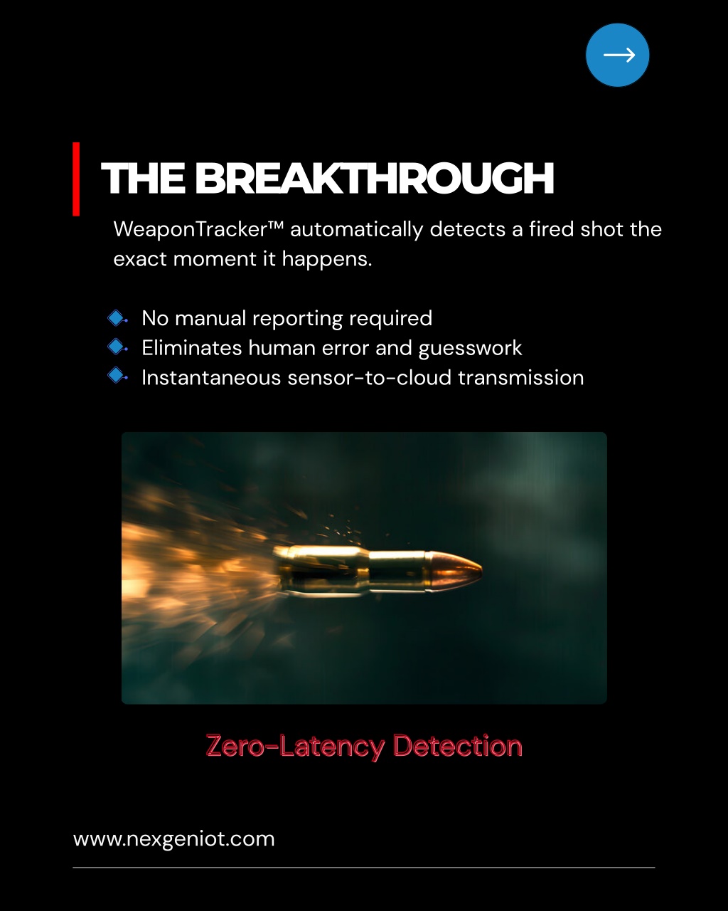 THE BREAKTHROUGH WeaponTracker™ automatically detects a fired shot the exact moment it happens. No manual reporting required Eliminates human error and guesswork Instantaneous sensor-to-cloud transmission Zero-Latency Detection Zero-LatencyDetection www.nexgeniot.com