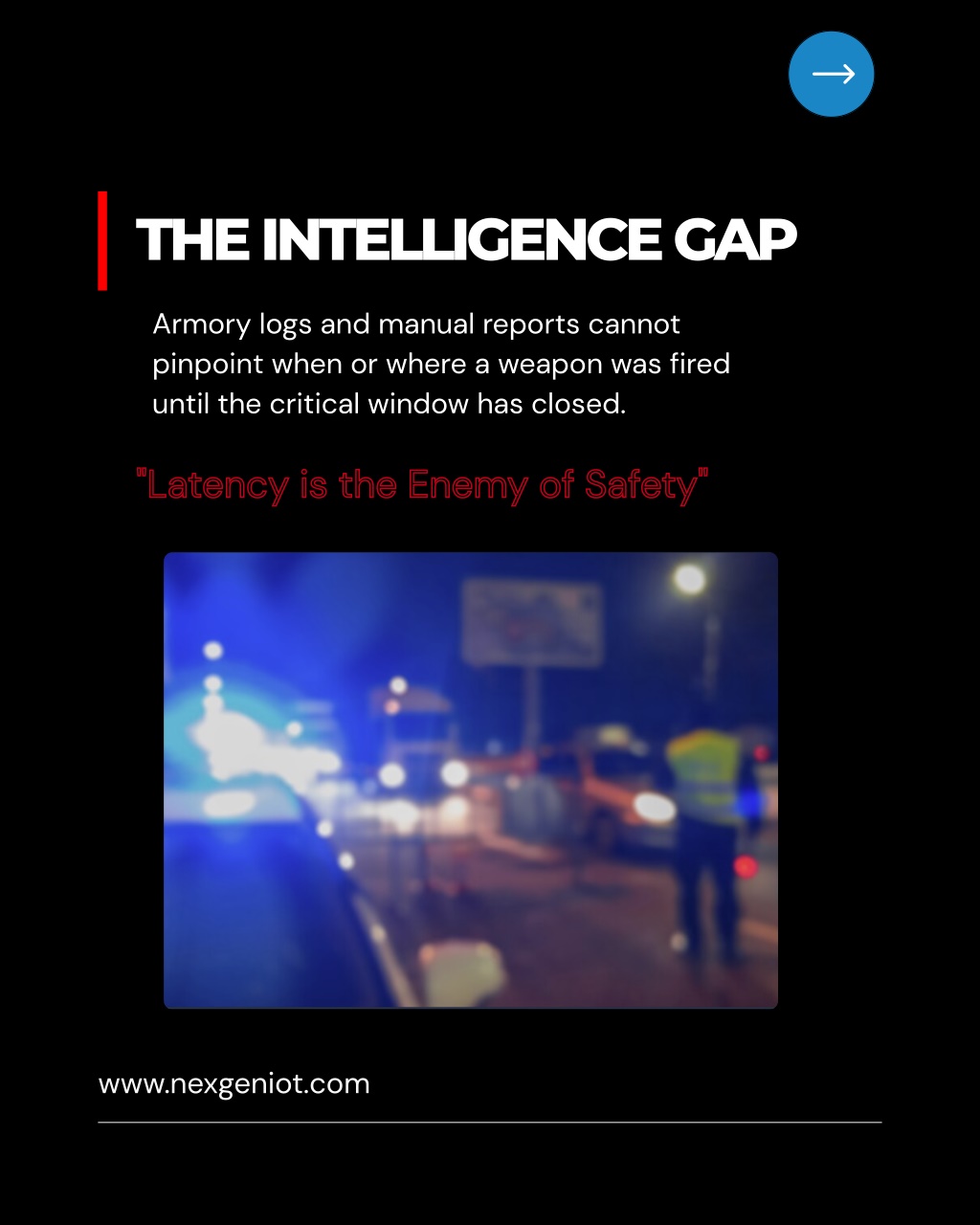 THE INTELLIGENCE GAP Armory logs and manual reports cannot pinpoint when or where a weapon was fired until the critical window has closed. "LatencyistheEnemyofSafety" www.nexgeniot.com