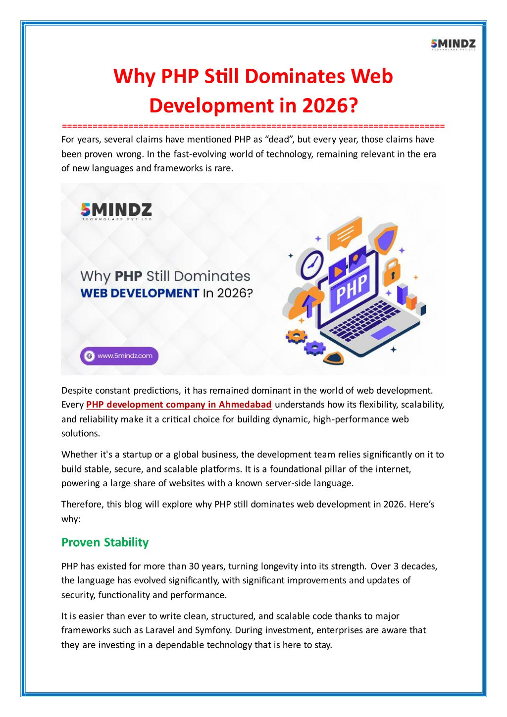 1. Why PHP Still Dominates Web Development in 2026? =========================================================================== For years, several claims have mentioned PHP as “dead”, but every year, those claims have been proven wrong. In the fast-evolving world of technology, remaining relevant in the era of new languages and frameworks is rare. Despite constant predictions, it has remained dominant in the world of web development. Every PHP development company in Ahmedabad understands how its flexibility, scalability, and reliability make it a critical choice for building dynamic, high-performance web solutions. Whether it's a startup or a global business, the development team relies significantly on it to build stable, secure, and scalable platforms. It is a foundational pillar of the internet, powering a large share of websites with a known server-side language. Therefore, this blog will explore why PHP still dominates web development in 2026. Here’s why: Proven Stability PHP has existed for more than 30 years, turning longevity into its strength. Over 3 decades, the language has evolved significantly, with significant improvements and updates of security, functionality and performance. It is easier than ever to write clean, structured, and scalable code thanks to major frameworks such as Laravel and Symfony. During investment, enterprises are aware that they are investing in a dependable technology that is here to stay.
