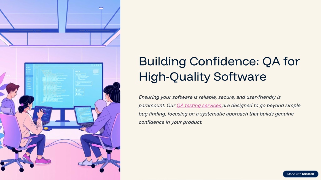 Building Confidence: QA for High-Quality Software Ensuring your software is reliable, secure, and user-friendly is paramount. Our QA testing services are designed to go beyond simple bug finding, focusing on a systematic approach that builds genuine confidence in your product.