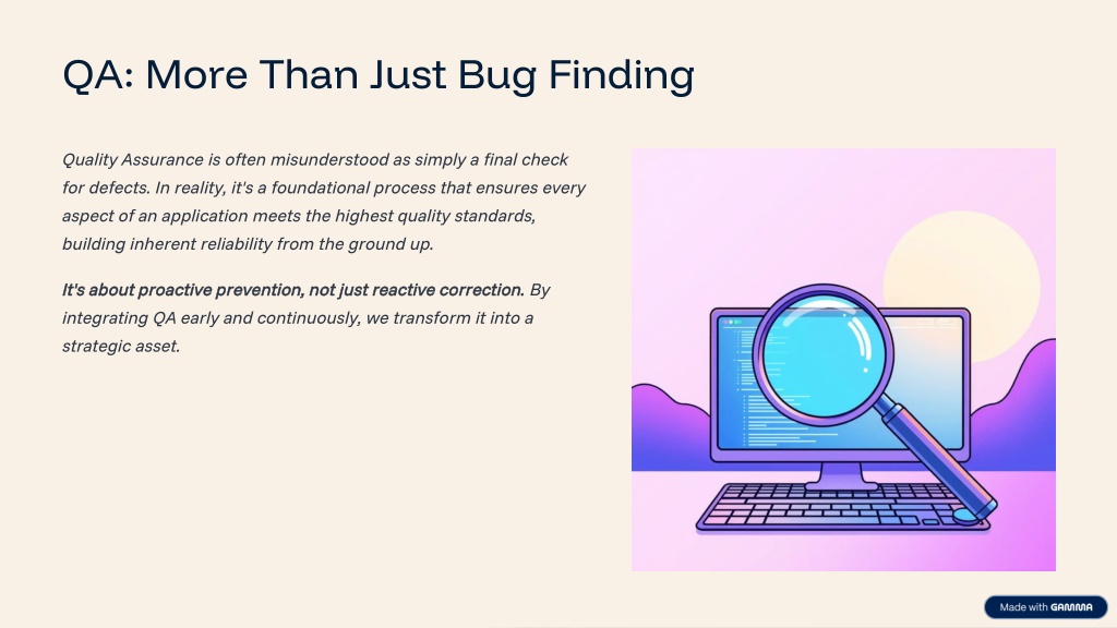 QA: More Than Just Bug Finding Quality Assurance is often misunderstood as simply a final check for defects. In reality, it's a foundational process that ensures every aspect of an application meets the highest quality standards, building inherent reliability from the ground up. It's about proactive prevention, not just reactive correction. By integrating QA early and continuously, we transform it into a strategic asset.