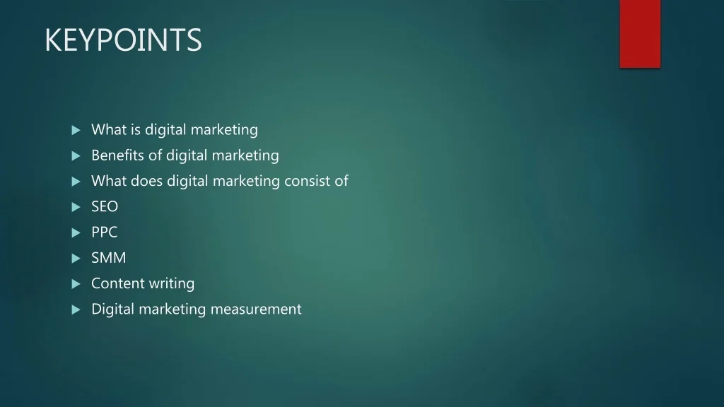 KEYPOINTS What is digital marketing Benefits of digital marketing What does digital marketing consist of SEO PPC SMM Content writing Digital marketing measurement