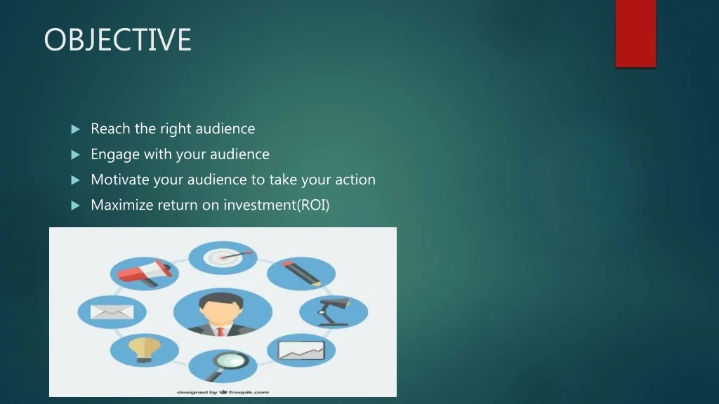 OBJECTIVE Reach the right audience Engage with your audience Motivate your audience to take your action Maximize return on investment(ROI)