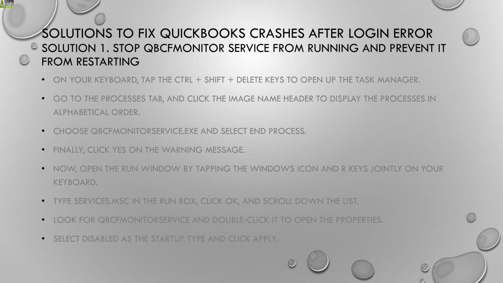 Solutions to Fix QuickBooks crashes after login errorSolution 1. Stop QBCFMonitor Service from running and prevent it from restarting On your keyboard, tap the Ctrl + Shift + Delete keys to open up the Task Manager. Go to the Processes tab, and click the Image Name header to display the processes in alphabetical order. Choose QBCFMonitorService.exe and select End Process. Finally, click Yes on the warning message. Now, open the Run window by tapping the Windows icon and R keys jointly on your keyboard. Type services.msc in the Run box, click OK, and scroll down the list. Look for QBCFMonitorService and double-click it to open the Properties. Select Disabled as the Startup Type and click Apply.