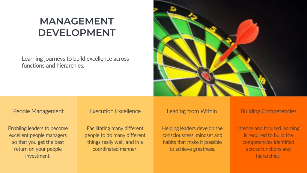 MANAGEMENT DEVELOPMENT Learning journeys to build excellence across functions and hierarchies. People Management Execution Excellence Leading from Within Building Competencies Enabling leaders to become excellent people managers so that you get the best return on your people investment. Facilitating many different people to do many different things really well, and in a coordinated manner. Helping leaders develop the consciousness, mindset and habits that make it possible to achieve greatness. Intense and focused learning is required to build the competencies identified across functions and hierarchies.