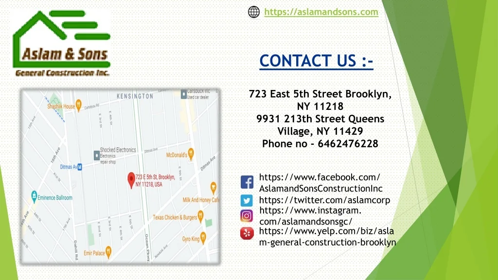 https://aslamandsons.com CONTACT US :- 723 East 5th Street Brooklyn, NY 11218 9931 213th Street Queens Village, NY 11429 Phone no - 6462476228 https://www.facebook.com/AslamandSonsConstructionInc https://twitter.com/aslamcorp https://www.instagram.com/aslamandsonsgc/ https://www.yelp.com/biz/aslam-general-construction-brooklyn