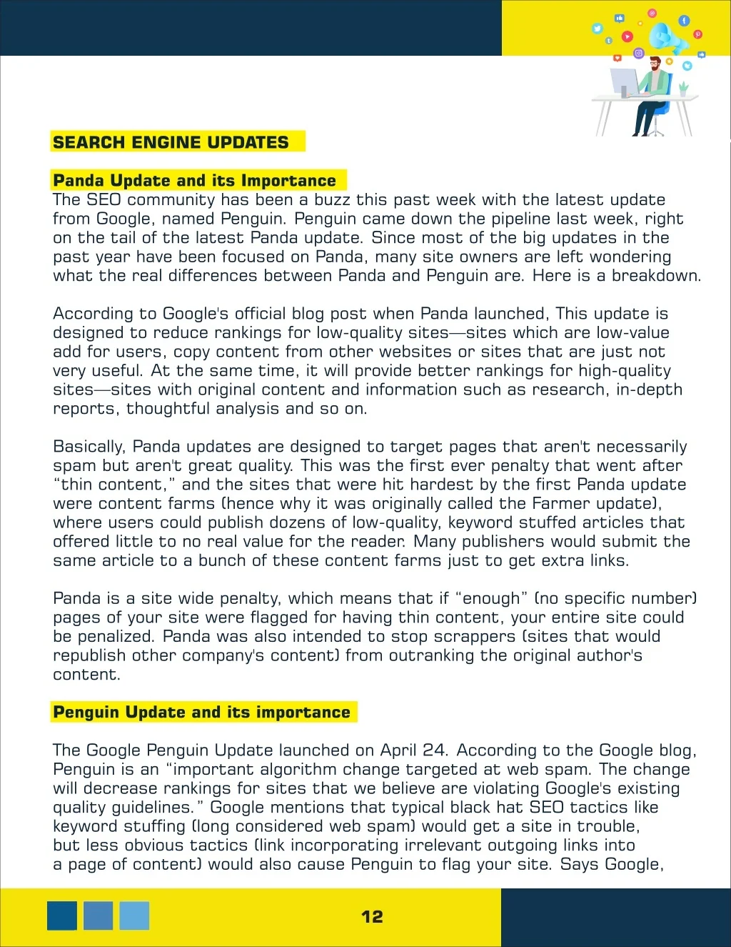 SEARCH ENGINE UPDATES Panda Update and its Importance The SEO community has been a buzz this past week with the latest update from Google, named Penguin. Penguin came down the pipeline last week, right on the tail of the latest Panda update. Since most of the big updates in the past year have been focused on Panda, many site owners are left wondering what the real differences between Panda and Penguin are. Here is a breakdown. According to Google's official blog post when Panda launched, This update is designed to reduce rankings for low-quality sites—sites which are low-value add for users, copy content from other websites or sites that are just not very useful. At the same time, it will provide better rankings for high-quality sites—sites with original content and information such as research, in-depth reports, thoughtful analysis and so on. Basically, Panda updates are designed to target pages that aren't necessarily spam but aren't great quality. This was the first ever penalty that went after “thin content,” and the sites that were hit hardest by the first Panda update were content farms (hence why it was originally called the Farmer update), where users could publish dozens of low-quality, keyword stuffed articles that offered little to no real value for the reader. Many publishers would submit the same article to a bunch of these content farms just to get extra links. Panda is a site wide penalty, which means that if “enough” (no specific number) pages of your site were flagged for having thin content, your entire site could be penalized. Panda was also intended to stop scrappers (sites that would republish other company's content) from outranking the original author's content. Penguin Update and its importance The Google Penguin Update launched on April 24. According to the Google blog, Penguin is an “important algorithm change targeted at web spam. The change will decrease rankings for sites that we believe are violating Google's existing quality guidelines.” Google mentions that typical black hat SEO tactics like keyword stuffing (long considered web spam) would get a site in trouble, but less obvious tactics (link incorporating irrelevant outgoing links into a page of content) would also cause Penguin to flag your site. Says Google, 12