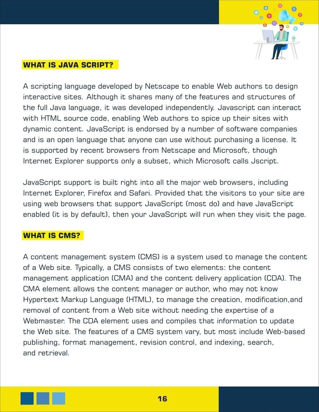 WHAT IS JAVA SCRIPT? A scripting language developed by Netscape to enable Web authors to design interactive sites. Although it shares many of the features and structures of the full Java language, it was developed independently. Javascript can interact with HTML source code, enabling Web authors to spice up their sites with dynamic content. JavaScript is endorsed by a number of software companies and is an open language that anyone can use without purchasing a license. It is supported by recent browsers from Netscape and Microsoft, though Internet Explorer supports only a subset, which Microsoft calls Jscript. JavaScript support is built right into all the major web browsers, including Internet Explorer, Firefox and Safari. Provided that the visitors to your site are using web browsers that support JavaScript (most do) and have JavaScript enabled (it is by default), then your JavaScript will run when they visit the page. WHAT IS CMS? A content management system (CMS) is a system used to manage the content of a Web site. Typically, a CMS consists of two elements: the content management application (CMA) and the content delivery application (CDA). The CMA element allows the content manager or author, who may not know Hypertext Markup Language (HTML), to manage the creation, modification,and removal of content from a Web site without needing the expertise of a Webmaster. The CDA element uses and compiles that information to update the Web site. The features of a CMS system vary, but most include Web-based publishing, format management, revision control, and indexing, search, and retrieval. 16