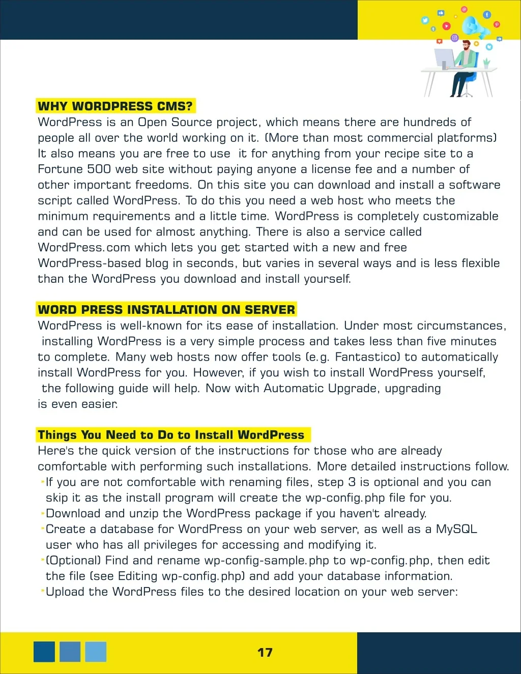 WHY WORDPRESS CMS? WordPress is an Open Source project, which means there are hundreds of people all over the world working on it. (More than most commercial platforms) It also means you are free to use it for anything from your recipe site to a Fortune 500 web site without paying anyone a license fee and a number of other important freedoms. On this site you can download and install a software script called WordPress. To do this you need a web host who meets the minimum requirements and a little time. WordPress is completely customizable and can be used for almost anything. There is also a service called WordPress.com which lets you get started with a new and free WordPress-based blog in seconds, but varies in several ways and is less flexible than the WordPress you download and install yourself. WORD PRESS INSTALLATION ON SERVER WordPress is well-known for its ease of installation. Under most circumstances, installing WordPress is a very simple process and takes less than five minutes to complete. Many web hosts now offer tools (e.g. Fantastico) to automatically install WordPress for you. However, if you wish to install WordPress yourself, the following guide will help. Now with Automatic Upgrade, upgrading is even easier. Things You Need to Do to Install WordPress Here's the quick version of the instructions for those who are already comfortable with performing such installations. More detailed instructions follow. If you are not comfortable with renaming files, step 3 is optional and you can skip it as the install program will create the wp-config.php file for you. Download and unzip the WordPress package if you haven't already. Create a database for WordPress on your web server, as well as a MySQL user who has all privileges for accessing and modifying it. (Optional) Find and rename wp-config-sample.php to wp-config.php, then edit the file (see Editing wp-config.php) and add your database information. Upload the WordPress files to the desired location on your web server: 17